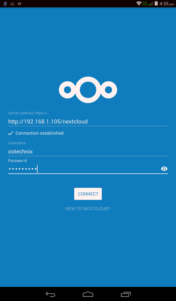 Once installed, launch it. You will see a screen like below. Enter the Nextcloud URL (Ex. http://IP_Address/nextcloud), login username and password.