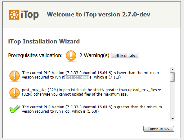 The installation of iTop is generally performed interactively using the “setup” page. However once information about the desired configuration has been collected by the setup page, the actual installation process is fully unattended and therefore can be automated.