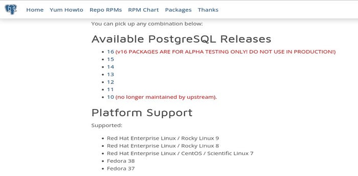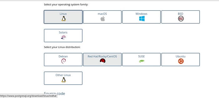- Go to the PostgreSQL website and select the operating system family as per your requirements. Here for this demo, I’m going to select Linux. Once you select Linux, it will ask which Linux distribution you want to go with. Choose, Red Hat/Rocky/CentOS.