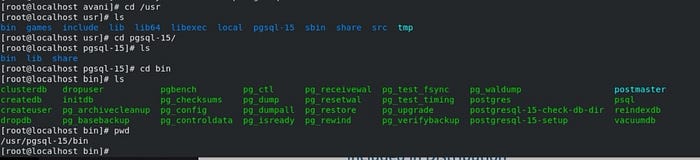 7. PostgreSQL15 has been successfully installed. To check, go to /usr/pgsql-15/bin: where all the executables are located.
