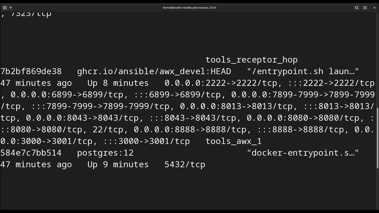 CONTAINER ID IMAGE COMMAND CREATED STATUS PORTS NAMES 4b91575d64b1 ansible/awx_task:9.2.0 "/tini -- /bin/sh -c…" About a minute ago Up About a minute 8052/tcp awx_task 9827b9831fa5 ansible/awx_web:9.2.0 "/tini -- /bin/sh -c…" About a minute ago Up About a minute 0.0.0.0:80->8052/tcp awx_web 47300ec1c26f postgres:10 "docker-entrypoint.s…" About a minute ago Up About a minute 5432/tcp awx_postgres 166b153faa27 ansible/awx_rabbitmq:3.7.4 "docker-entrypoint.s…" About a minute ago Up 58 seconds 4369/tcp, 5671-5672/tcp, 15671-15672/tcp, 25672/tcp awx_rabbitmq 0f36c9784f74 memcached:alpine "docker-entrypoint.s…" About a minute ago Up About a minute 11211/tcp awx_memcached